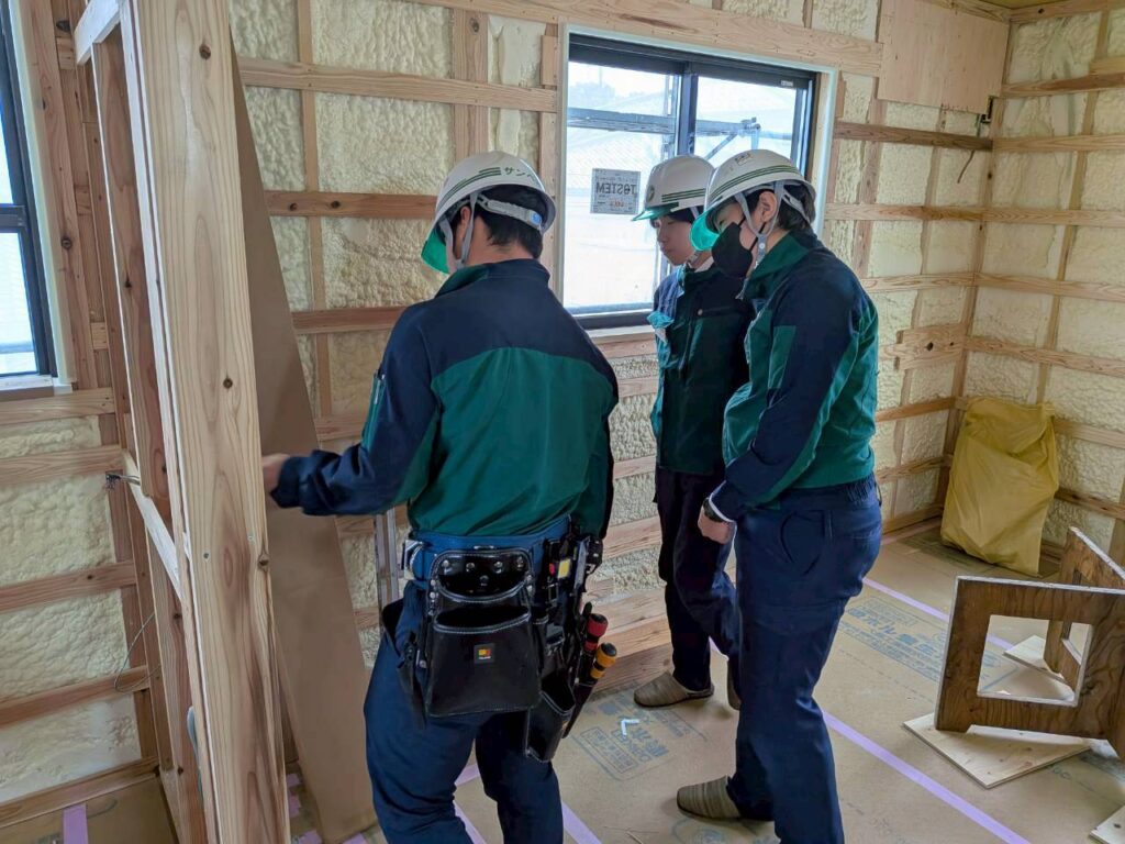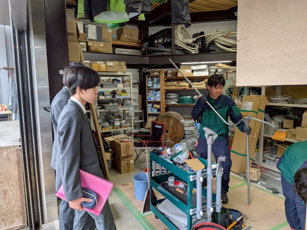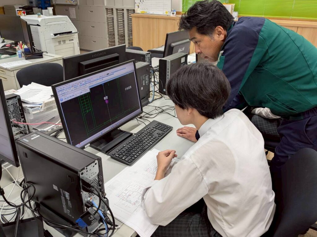 今年は工務社員へのインタビュー、高所作業車体験、設計・積算・図面作成等、職業体験をしたり作業の見学に真剣な表情で取り組んでいました。